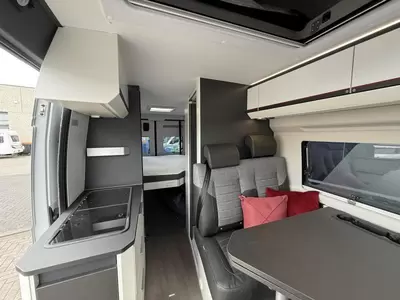 De praktische standaardzit biedt een prima, ruime gelegenheid om gezellig samen te zitten. Het keukenblok is centraal in de camper geplaatst. Voor een snelle toevoer van warm water is er een boiler aanwezig. De inbouwkoelkast met vriescompartiment heeft een grote inhoud.