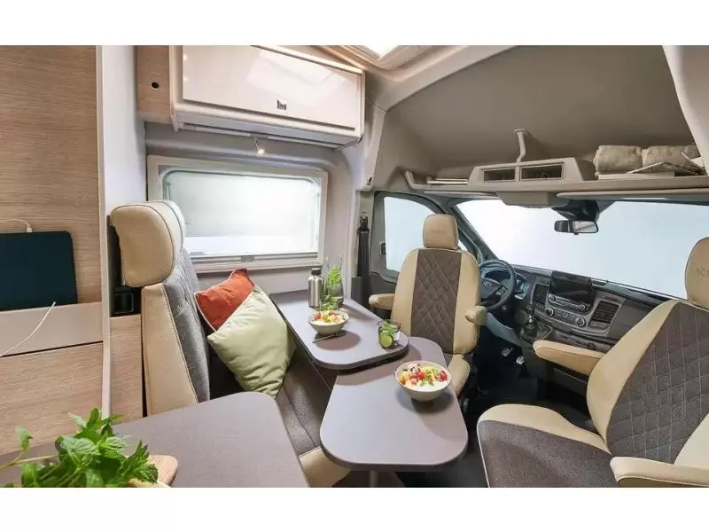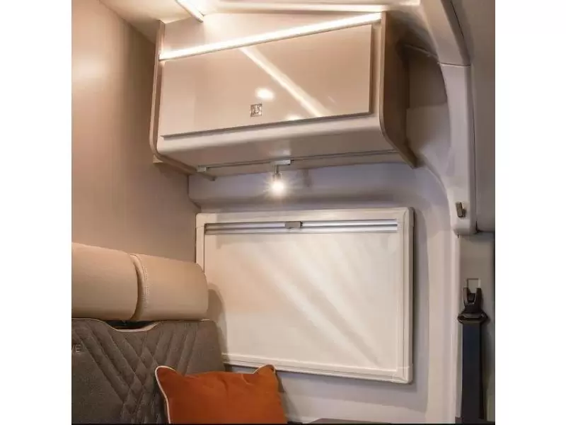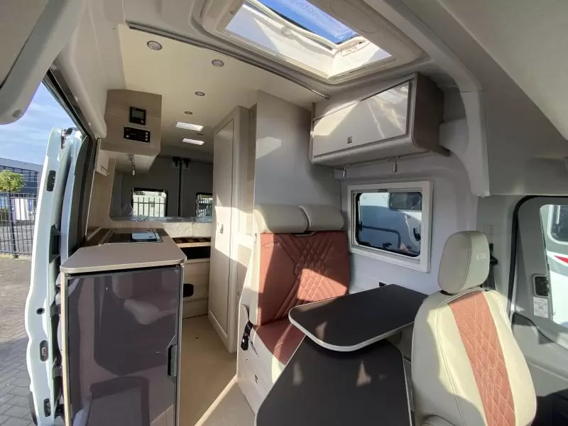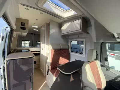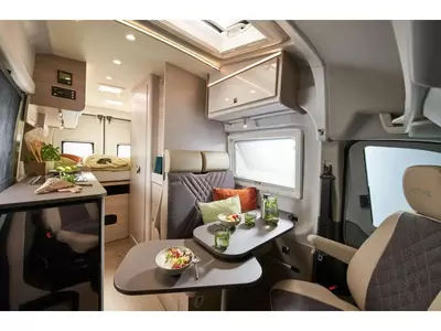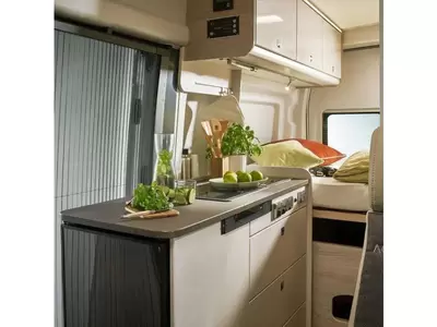Een prima gelegenheid om gezellig te eten of nieuwe plannen te maken wordt gevormd door de halve treinzit. De keuken is in het midden van de camper gemonteerd en beschikt onder meer over een 2-pits kooktoestel en gootsteen met kraan. De koelkast met vriesvak biedt voldoende ruimte voor heel uw voorraad.