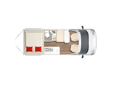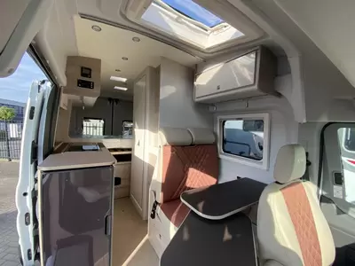 Deze camper beschikt over een badkamer. Hierin bevindt zich een wastafel en ingebouwd cassettetoilet. Naast het slaapgedeelte bevindt zich ook de douchegelegenheid.