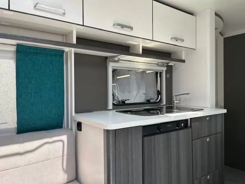De riante rondzit is ideaal om gezellig aan te eten en te drinken, maar kan ook als extra slaapplaats dienen. Centraal in de caravan bevindt zich de praktisch ingedeelde en ruime middenkeuken, welke geheel compleet is uitgerust met een spoelbak, kraan en 3-pits kooktoestel. De apothekerskast biedt u een fraaie opbergruimte voor al uw voorraad. De 5 liter boiler, die in de caravan is ingebouwd, voorziet u snel van warm water. De ladekast biedt u een fraaie bergplaats voor al uw keukenspulletjes.