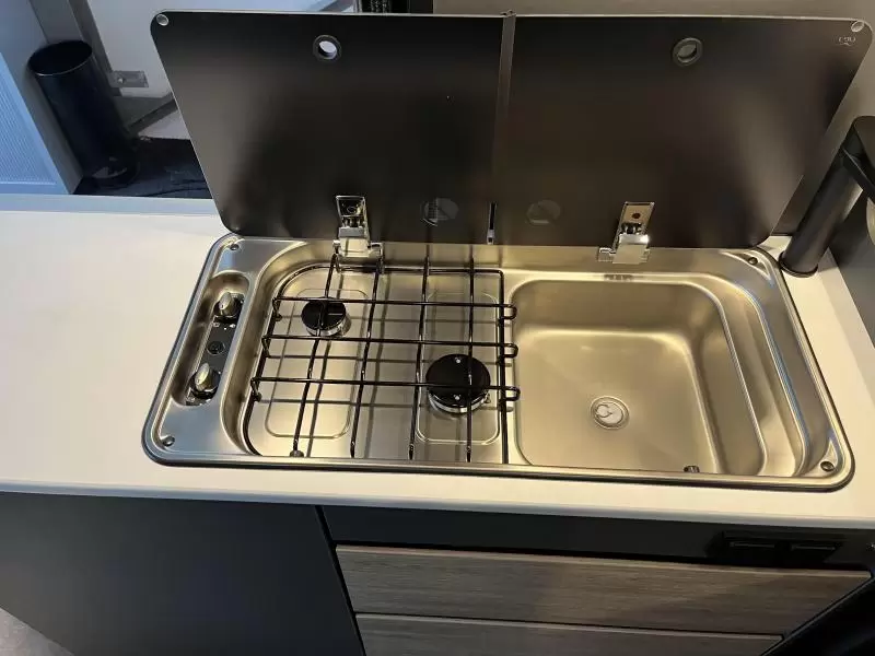 In de ruime treinzit vindt u een gezellige plek om te zitten, deze kan uiteraard ook dienen als extra slaapplaats. De keuken is in het midden van de camper geplaatst en beschikt over een 2-pits kooktoestel en gootsteen met kraan. De boiler, die in de camper is ingebouwd, voorziet u snel van warm water. Om uw etenswaren op te bergen is er een koelkast met vriescompartiment ingebouwd.