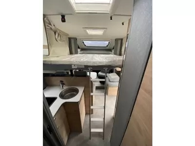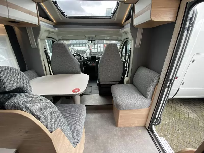 De centraal geplaatste middendinette biedt volop gelegenheid om gezellig samen te zitten. Het keukenblok is centraal in de camper gemonteerd en is onder anderen uitgerust met 3-pits gascomfoor, spoelbak en kraan. Een ingebouwde boiler voorziet je van warm water. Om jouw etenswaren op te bergen is er een koelkast met vriescompartiment ingebouwd.