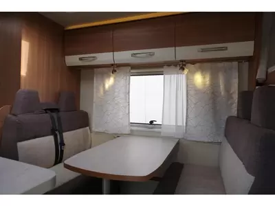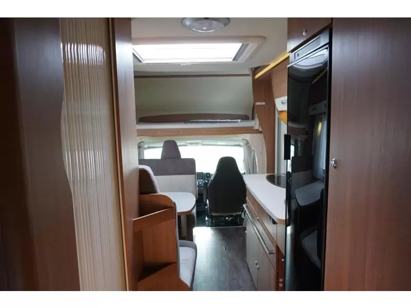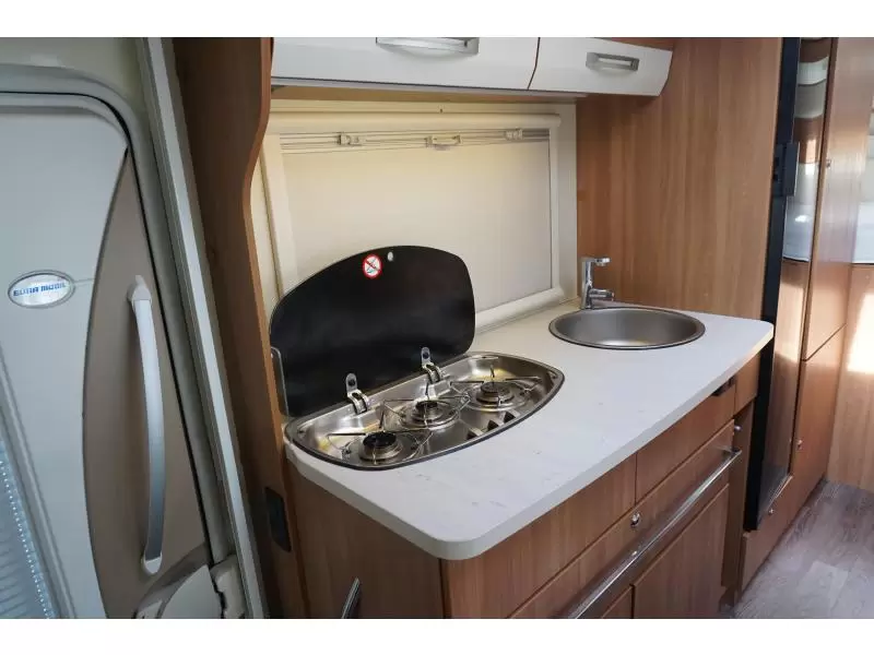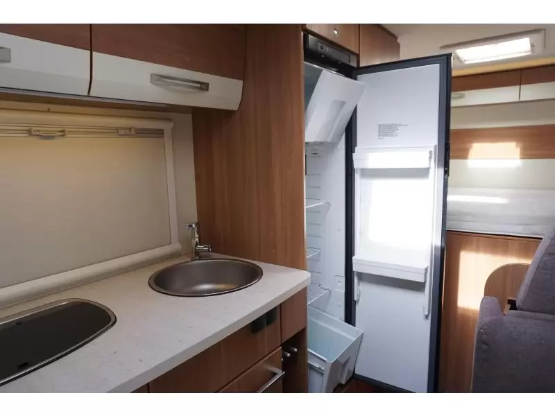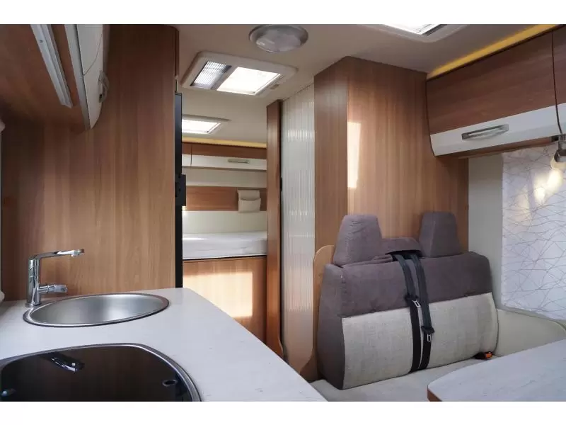 In de ruime treinzit vindt u een gezellige plek om te zitten, deze kan uiteraard ook dienen als extra slaapplaats. De complete keuken is in het midden van de camper geplaatst. Voor een snelle toevoer van warm water is er een boiler aanwezig. De koelkast met vriescompartiment is ruim genoeg voor al uw etenswaren.