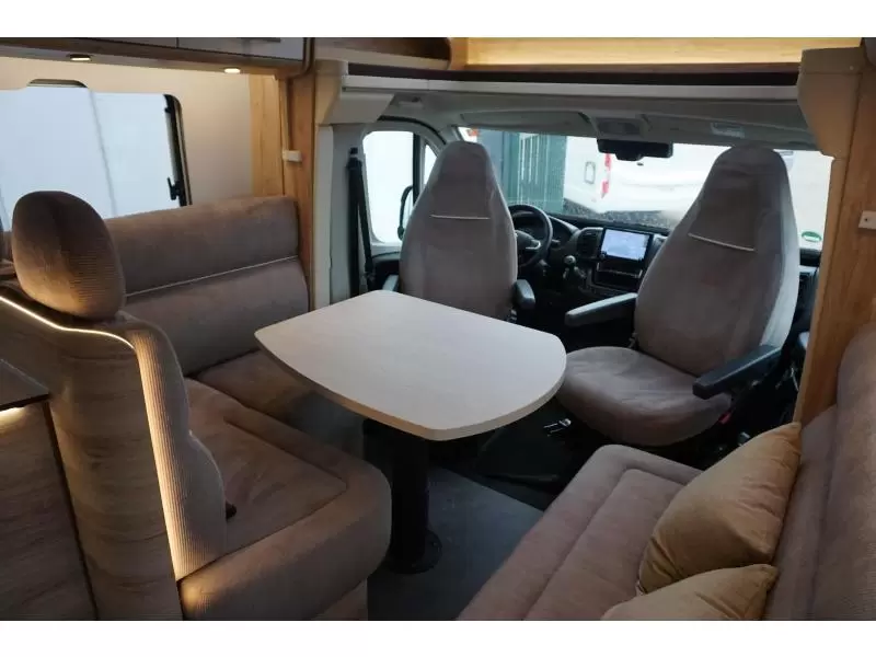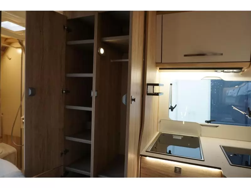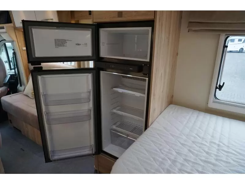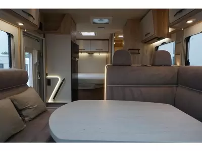 Een sfeervolle L-zit nodigt u uit voor de nodige gezellige uurtjes. Centraal in de camper bevindt zich de middenkeuken, uitgerust met een spoelbak, kraan en 3-pits kooktoestel. Er is een boiler aanwezig, die u van warm water voorziet. De koelkast met vriescompartiment is ruim genoeg voor al uw etenswaren.