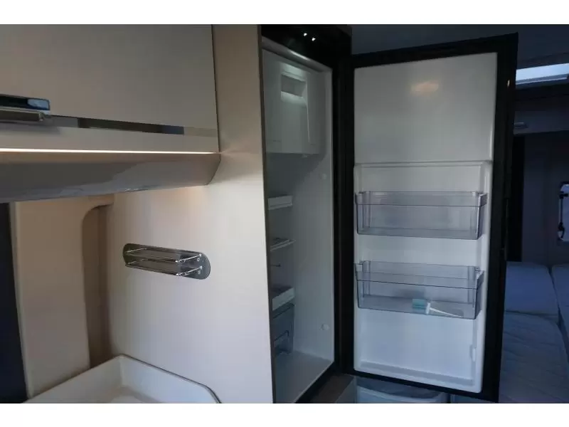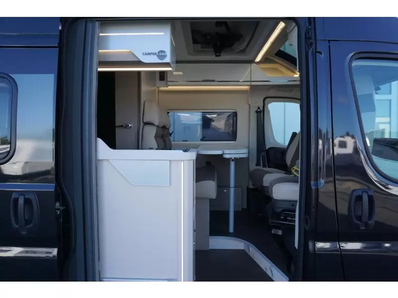 Om gezellig samen te kunnen zitten, eten en drinken is de camper voorzien van een praktische standaardzit. De complete keuken is in het midden van de camper geplaatst. Een ingebouwde boiler voorziet u van warm water. Om uw etenswaren op te bergen is er een koelkast met vriescompartiment ingebouwd.