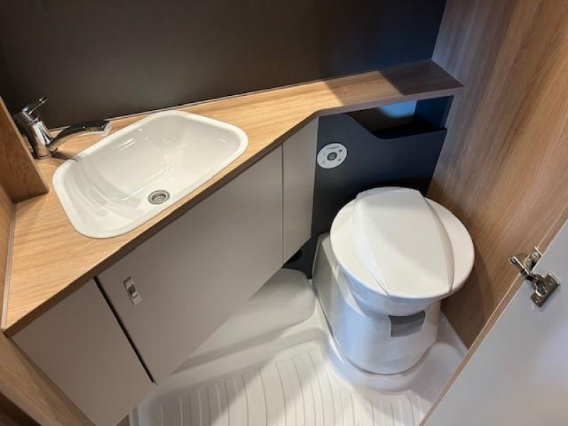 Een extra slaapgelegenheid wordt gevormd door de comfortabele, gezellige treinzit. Het keukenblok, dat centraal in de caravan is gemonteerd, heeft voldoende bergruimte en is uitgerust met een 3-pits gascomfoor, spoelbak en kraan. Een ingebouwde boiler voorziet u van warm water. De koelkast met vriesvak biedt voldoende ruimte voor heel uw voorraad.