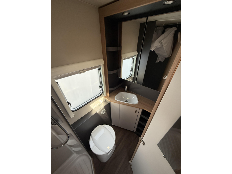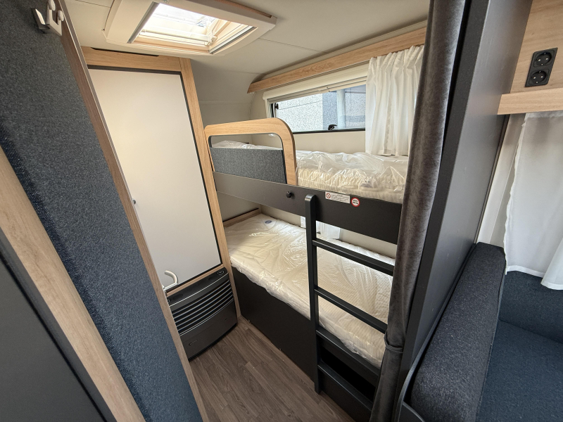 In het stapelbed, dat in de lengte is gemonteerd en daardoor goed bereikbaar is, hebben de kinderen hun eigen plekje. In het ruime, dwars geplaatste bed kunnen 2 personen slapen. Om u van een welverdiende nachtrust te laten genieten, hebben de bedden niet alleen lattenbodems, maar ook traagschuimmatrassen. De badkamer biedt wasgelegenheid in de vorm van een wastafel. Ook is er een ingebouwd cassettetoilet. Naast het slaapgedeelte bevindt zich ook de douchegelegenheid.