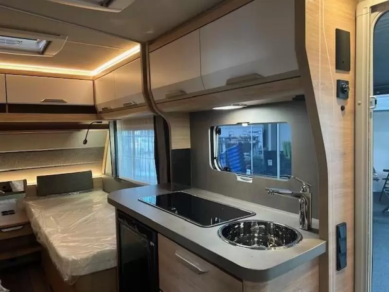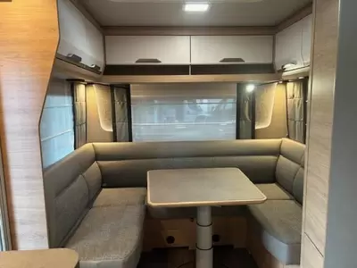 De caravan heeft een gezellige rondzit die u eenvoudig kunt ombouwen tot comfortabele slaapplaats. De middenkeuken is zeer compleet uitgevoerd. Er is een boiler aanwezig, die u van warm water voorziet. Om uw etenswaren op te bergen is er een koelkast met vriescompartiment ingebouwd.