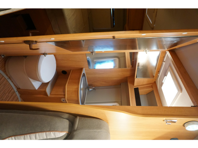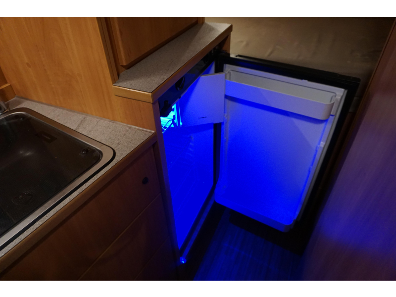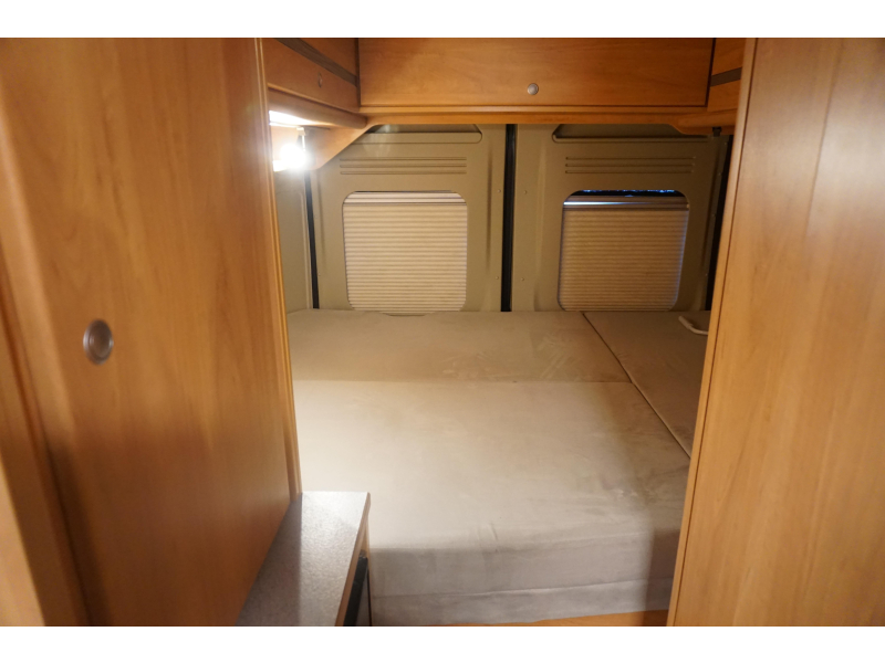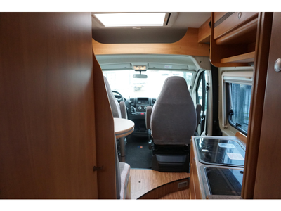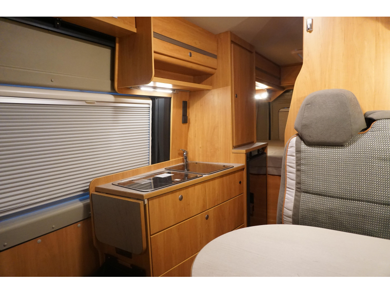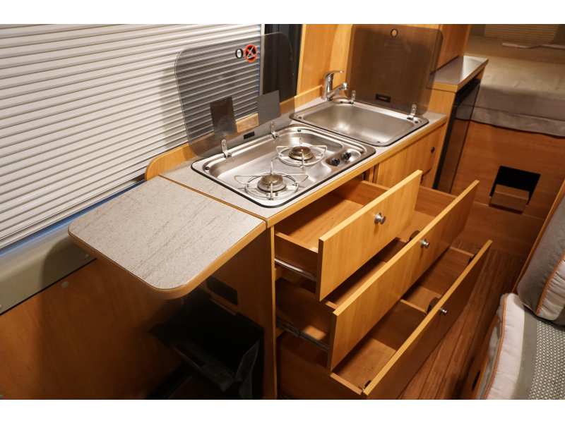 De handige standaardzit biedt niet alleen de nodige ruimte om te zitten, maar kan ook als slaapgelegenheid worden gebruikt. De middenkeuken is zeer compleet uitgevoerd. De 10 liter boiler, die in de camper is ingebouwd, voorziet u snel van warm water. Om uw etenswaren op te bergen is er een koelkast met vriescompartiment ingebouwd.