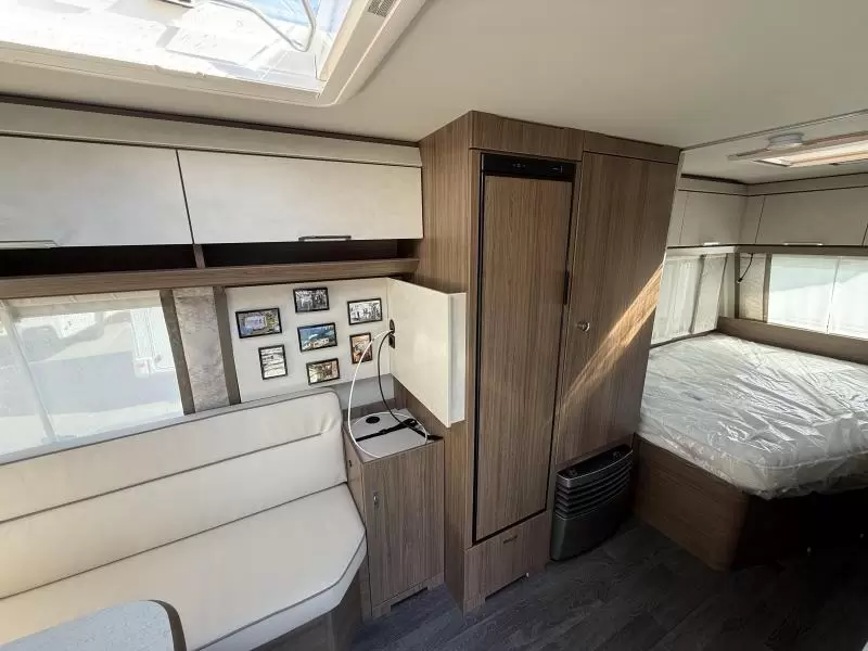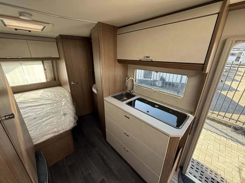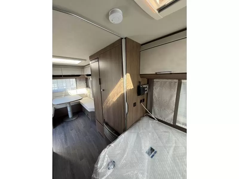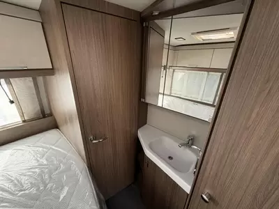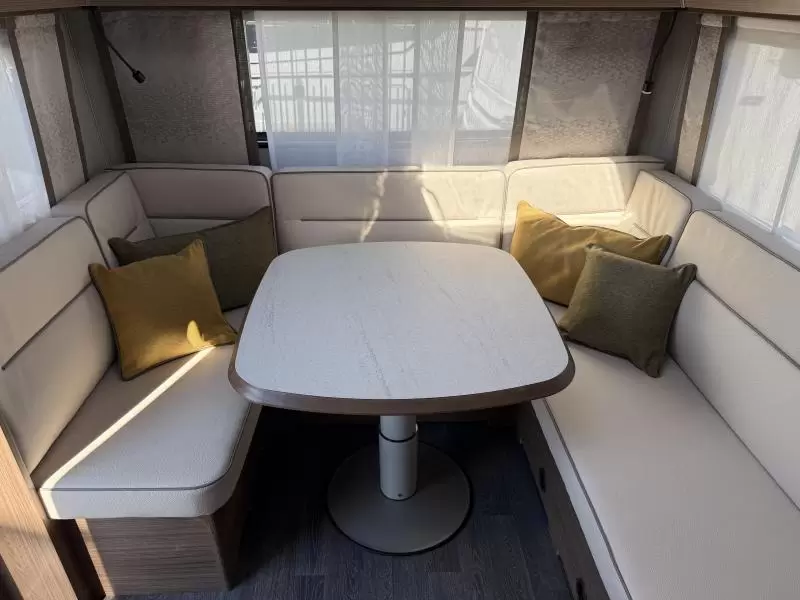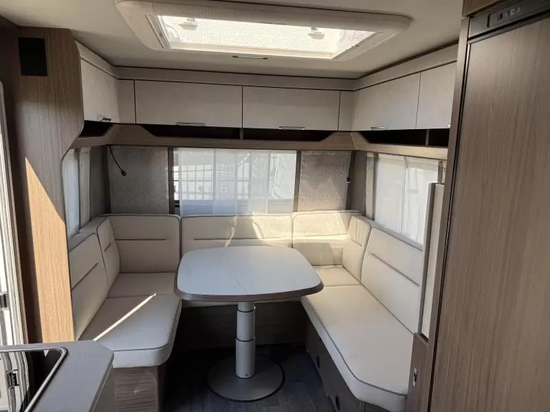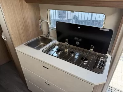 De riante rondzit is ideaal om gezellig aan te eten en te drinken, maar kan ook als extra slaapplaats dienen. Het keukenblok is centraal in de caravan gemonteerd en is onder anderen uitgerust met een 3-pits gascomfoor, spoelbak en kraan. Er is een boiler aanwezig, die u van warm water voorziet. De koelkast (142 liter) met vriesvak biedt voldoende ruimte voor heel uw voorraad.