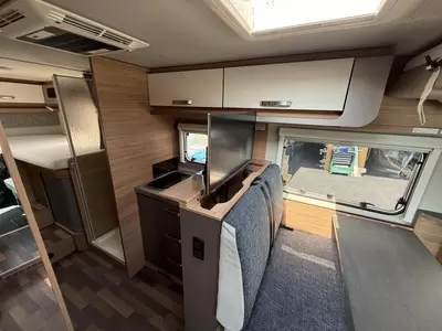 U vindt in de camper onder meer een standaardzit, die naar wens kan worden omgebouwd tot slaapgelegenheid. De middenkeuken, waar de camper over beschikt, is onder meer voorzien van een 3-pits kooktoestel, spoelbak en kraan. Een ingebouwde boiler voorziet u van warm water. De koelkast met vriesvak biedt voldoende ruimte voor heel uw voorraad.