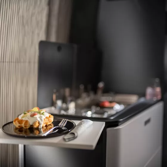 Bereid de lekkerste maaltijden op de compacte keuken met uittrekbaar werkblad. Met de geïntegreerde kookplaat, spoelbak en een grote koelkast is alles binnen handbereik van de chef. Het keukenblok is voorzien van zacht sluitende grote lades.