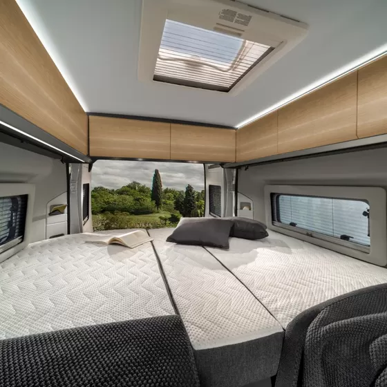 De Adria Twin Supreme modellen hebben een slaapkamer met verschillende bedopstellinge. Vaste, hefbare of opklapbare bedden met kwaliteitsmatrassen, alles is mogelijk in deze unieke buscamper.