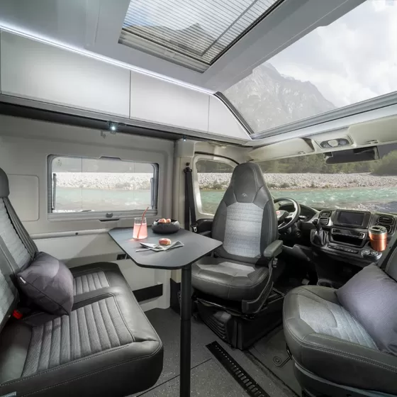 Ontspan in eigentijdse leefruimtes. De salon, in open loft stijl, biedt een ruime dinette onder een panoramisch dakraam. De multifunctionele tafel is uitschuifbaar, draagbaar en opbergbaar. Met dimbare verlichting voor optimale sfeerregeling.
