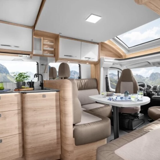 Binnen in de Profila RS zorgt het geïntegreerde hefbed dat in het plafond verdwijnt voor een open en royale leefruimte. De woonkamer heeft een ruim zitgedeelte met draaibare stoelen en zachte matrassen, aangevuld met ambient en LED verlichting voor een gezellige sfeer.