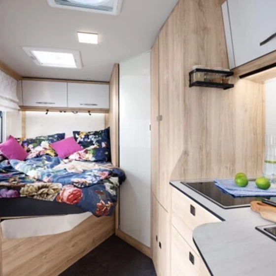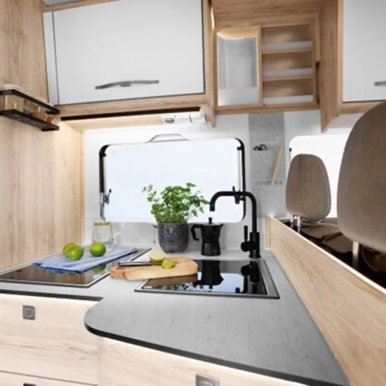 De keuken van de Profila RS is praktisch ontworpen met een 2‑pits kookplaat met elektrische ontsteking, een 142 liter koelkast en ergonomische werkruimte. Ruime laden met soft‑close en diepe kastruimte maken koken onderweg efficiënt en overzichtelijk.