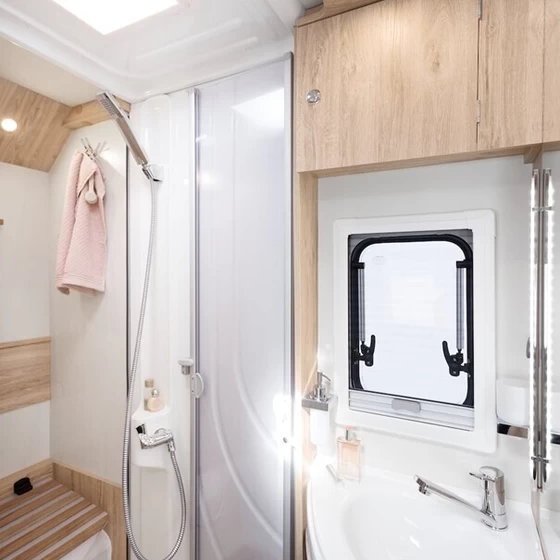 Het sanitair is flexibel ingedeeld en biedt bij sommige plattegronden een centrale badkamer met geïntegreerde douche, of een aparte doucheruimte. Toilet, wastafel en opbergruimte zorgen voor een comfortabele badkamerervaring tijdens je reis.