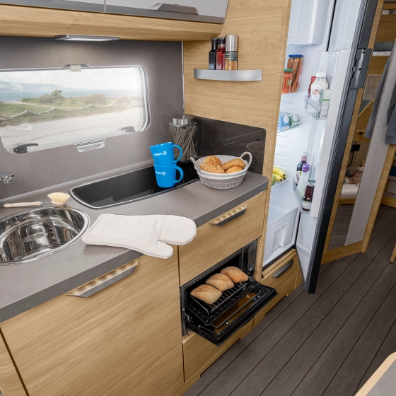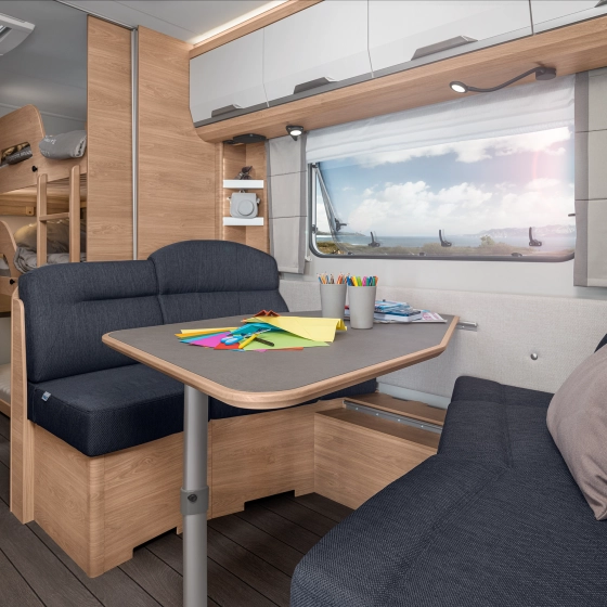Genoeg ruimte voor de hele familie in de gezellige zithoek. Door zijn ergonomisch gevormde kussens en een lichte, warme sfeer is het interieur comfortabel en huiselijk. Het grote panorama dakraam zorgt voor een prachtig uitzicht.